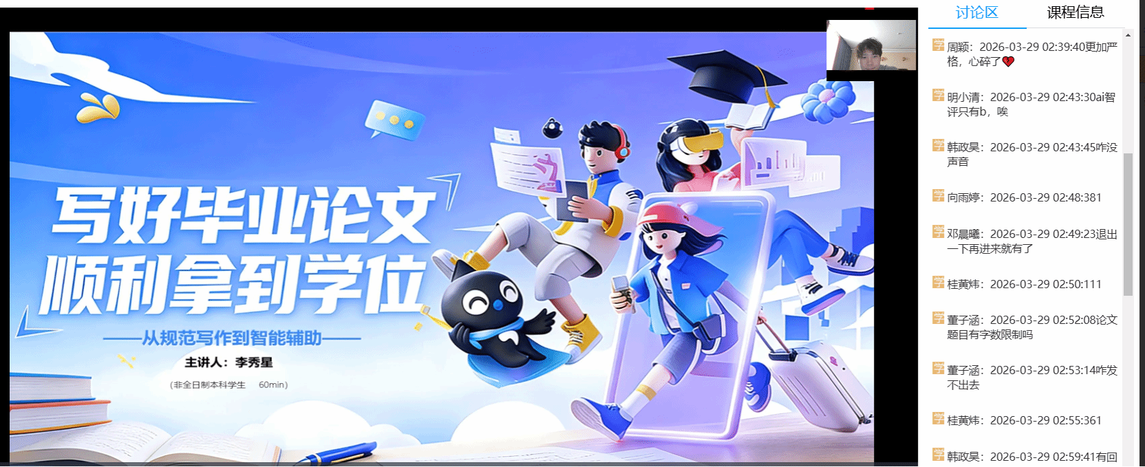 本科毕业论文(设计)作为高等教育人才培养质量的关键衡量指标与核心实践环节,是检验高校教学质量与育人成效的重要标尺。与普通全日制学生相比,自考生往往缺乏系统、集中的学术指导,在论文选题、研究方法运用、学术规范遵循等方面存在明显短板,学院经过前期深入细致地调研,精准把握自考生在论文写作过程中的痛点与难点,精心策划并组织了武汉科技大学高等教育自学考试本科毕业论文写作专题培训。为方便考生学习,此次培训于 3 月 29 日下午,依托武科大自学考试教学云平台,以“云端”直播+后期回放的形式开展,吸引了约200名自考生同时在线参与交流。